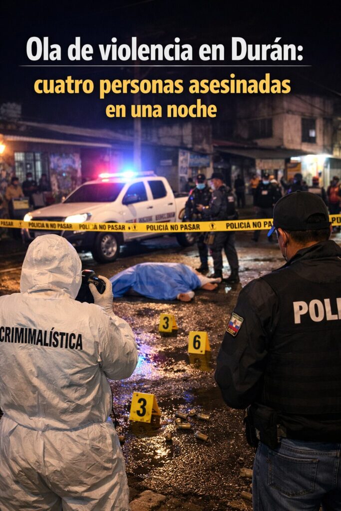 Una nueva jornada de violencia estremeció al cantón Durán, donde al menos cuatro personas fueron asesinadas en distintos hechos registrados durante la noche del lunes 26 de enero, según información preliminar de la Policía Nacional.